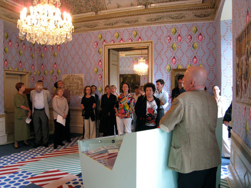 Herbert Lachmayer verantwortete vor zwei Jahren die in ihrer facettenreichen Ausführlichkeit und Sinnlichkeit imponierende Wiener Mozart-Ausstellung und führt uns persönlich durch sein neues Gesamtkunstwerk: Historische Dokumente, Höfische Devotionalien, Büsten und Biographien vor einer extra für die Ausstellung erdachten bunten Tapete von Franz West mit den Bildnissen der Weimarer Fürsten und der in Weimar gehaltenen und archivierten Kulturgrößen. Der von Roy Lichtenstein gestaltete Teppichboden ist nicht ohne Ironie der Ausstellung in den klassizistischen Schlossräumen unterlegt.