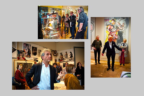Vor den Bildern diskutieren der Künstler und Stefan Winter. Sie lernten sich im Club Bel Etage kennen. Professor Winter schrieb auch im Katalog über den Künstler. Erfreulich.