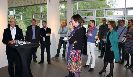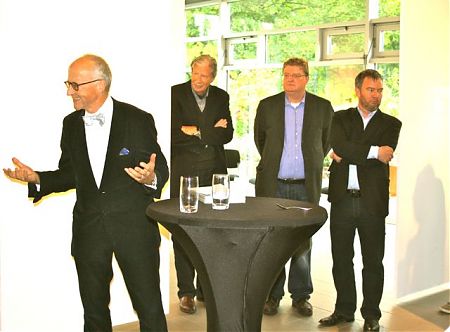 Danach erläuterte Gerrit Gohlke die Ausstellungs-Idee und die intelligente Realisierung. Die Bilder hängen auf der einen Seite von schmalen Panelen. Auf der Rückseite dieser finden sich Texte, die nicht erläutern und pädagogisch erklären, sondern Fragen aus dem Umfeld der Bilder stellen.
