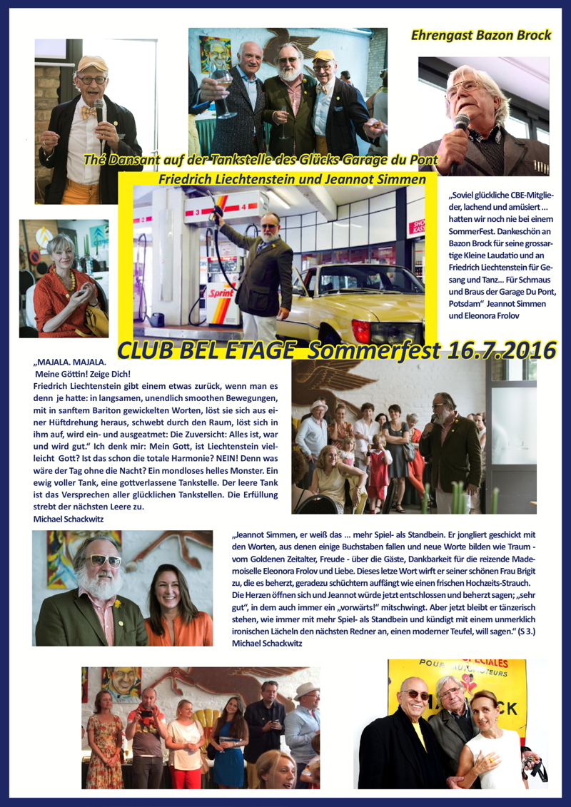 CBE-SommerFest: Thé dansant mit Friedrich Liechtenstein „Tankstellen des Glücks“; Laudatio von Bazon Brock (Ehrengast), Ansprache Jeannot Simmen, „Garage du Pont“ in Potsdam, 16. Juli 2016