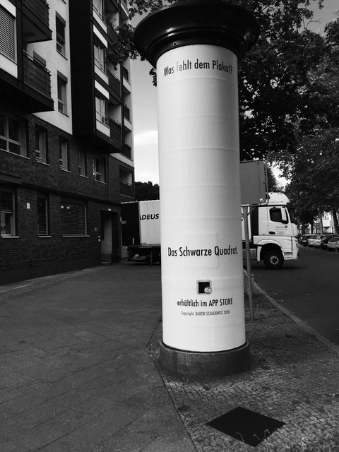 „Was fehlt dem Plakat“ – "Das Schwarze Quadrat“. Plakatsäule Emserstrasse / Hohenzollerndamm: Eine neue App: „100 Jahre Schwarzes Quadrat“, 6. Okt. 2016